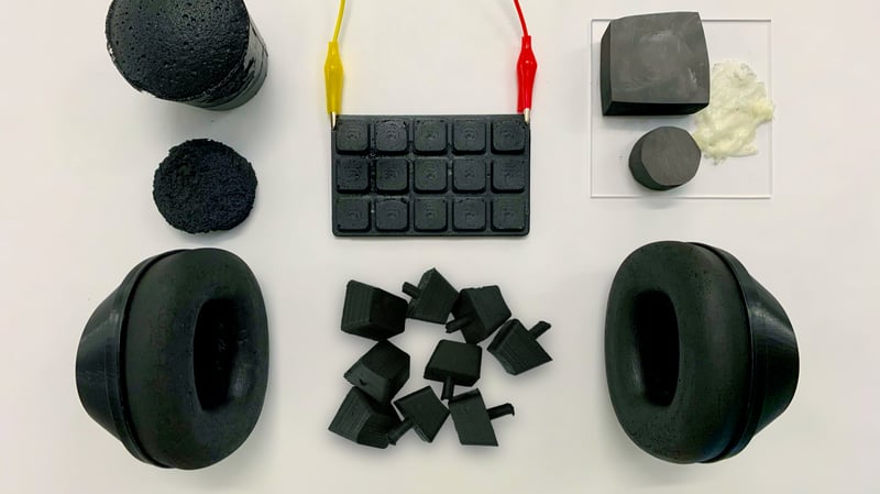 I experimented with mixing graphite and graphene, into flexible materials like polyurethane foam. The combined materials were made into flexible and conductive interfaces like headphone cushions and soft keyboards. This creates additional affordances for these interfaces, such as bio-sensing and analog actuation.