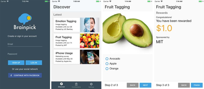 What if everyday people could help researchers and data scientists perform short tasks on their smartphones in exchange for micro-payment? Brainpick makes it possible by bringing these two groups of people together on a single platform. It is an intelligence crowdsourcing app that minimizes researchers' time and effort in data collection and processing.