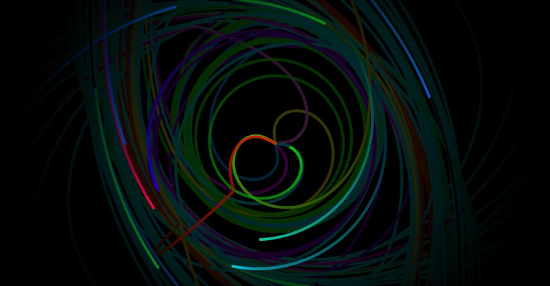 Besides, I want the graffiti to be unique so that different people painting it would result in completely different trajectories of particles. I admittedly geeked out a little bit — instead of relying on simple randomness, I made the particles interact with each other based on Newton's law of gravity. According to the chaos theory, this kind of n-body system is chaotic (mathematically unpredictable) and a slight change to the input results in drastic changes in the output. When more and more people touch the artifact, their data points leave colorful yet unique traces of movement that resemble a graffiti drawing.