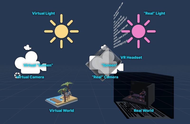 The entire scene comprises three layers - Virtual World, "Real" World, and XR Headset. The camera in each world can only see the objects in its own layer, and similarly, light sources can only lit objects in their own layer. However, the main AR camera can see both the "Real" World and the XR Headset layers.