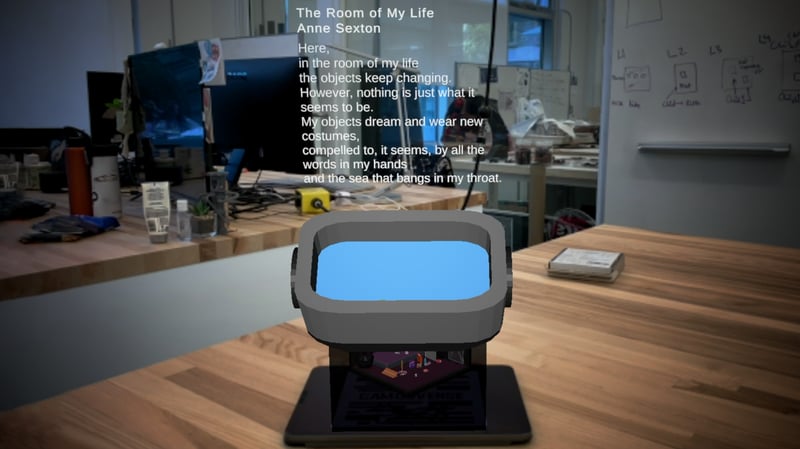 When participants point their camera to the AR marker, their screens show a person wearing a tiny XR headset sitting in a windowless room full of garbage. Meanwhile, there is another room-size XR headset pointing at the room. If the viewers view the room through this XR headset, they can see the person in a beautiful beach. However, the image is interleaved with glitches and flashes of the harsh reality. The whole experience is mediated through a constant stream of liminal background music.