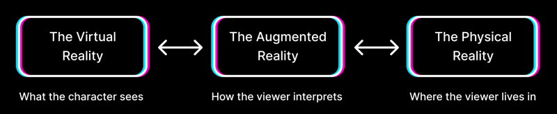 The data from both the virtual camera and "real" cameras is streamed to the "Screen" object through their corresponding RenderTextures. A glitch effect shader is specifically added to the result of the virtual camera as a URP post-processing step. In addition, the "Screen" randomly switches between the two RenderTextures to show a flash of the "real" world.