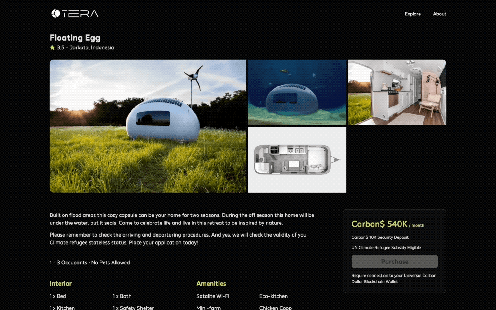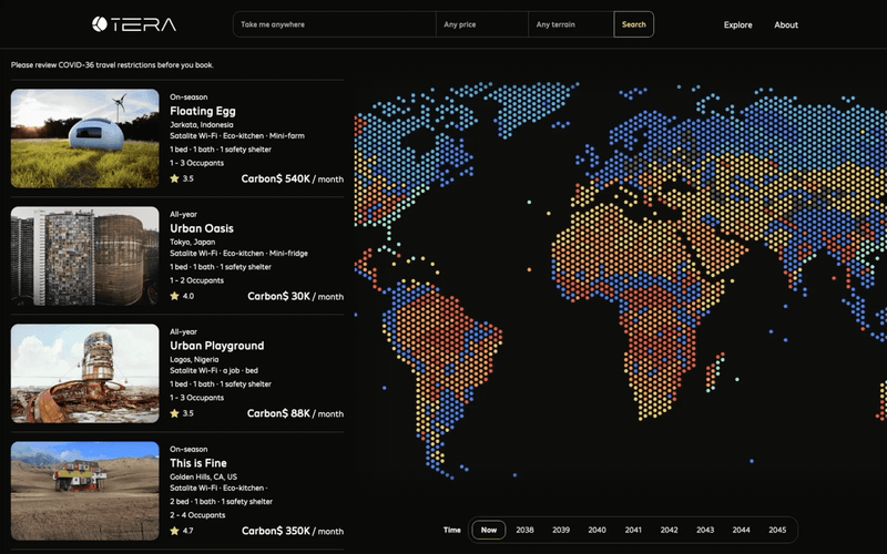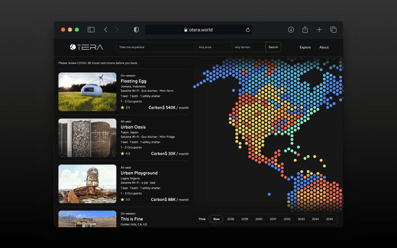Otera supports the "living" of both the rich people who can afford climate-resistant housing and the poor people whose living conditions depend heavily on the extreme weather. Users, including neo-nomads and co-existentialists, can filter the search result by the types of terrain, locations, prices, and weather conditions.