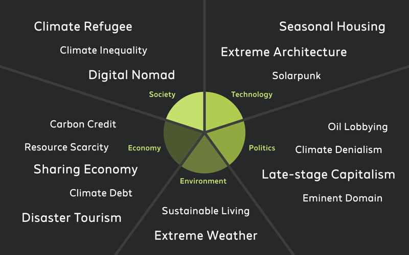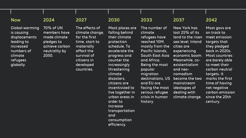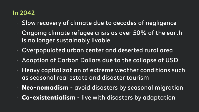 The specific scenario we chose in the forecasting stage was further explored in the envisioning stage. We extrapolated a set of phenomena and events and used them to build a cohesive narrative around Climate Capitalism. We also speculated two potential philosophical perspectives that may emerge in this future - Neo-nomadism and Co-existentialism.