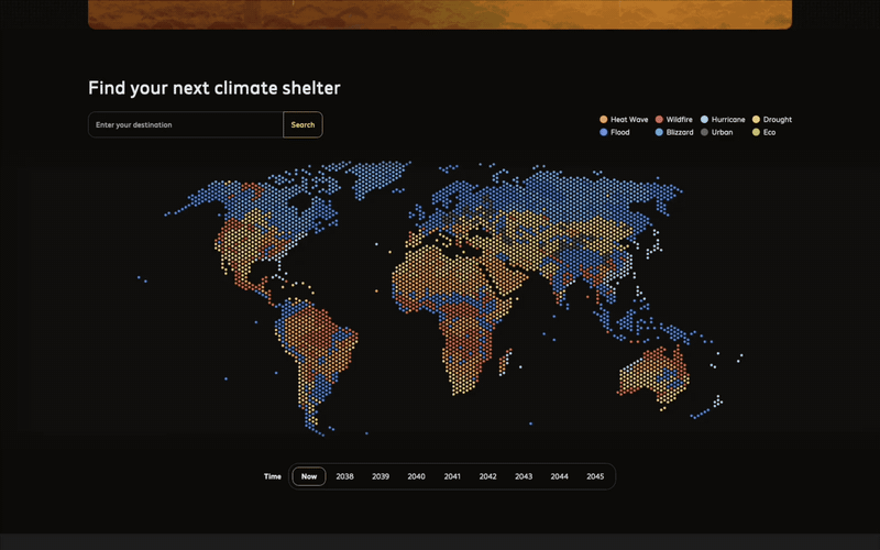 The Otera website is an Airbnb-like online marketplace offering housing and travel experiences to customers ranging from climate refugees and resourceful individuals. Through an interactive and immersive web browsing experience, we aim to make the viewers feel like they are browsing a fully functioning website in the exact future that Otera is in.