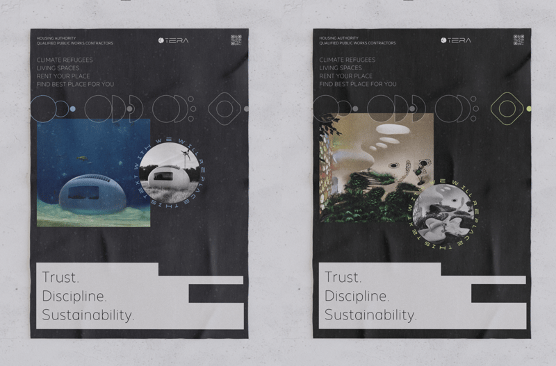 The posters showcased two examples of seasoning housing. The left side is a waterproof house in seasonally flooded regions submerged under water until the flood recedes. The right side is a house in an area suffering from heat wave that use indoor plants for natural cooling. We speculated that with the help of advanced construction technologies, extreme architecture became a common type of listing in the marketplace.