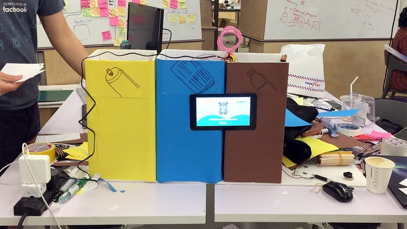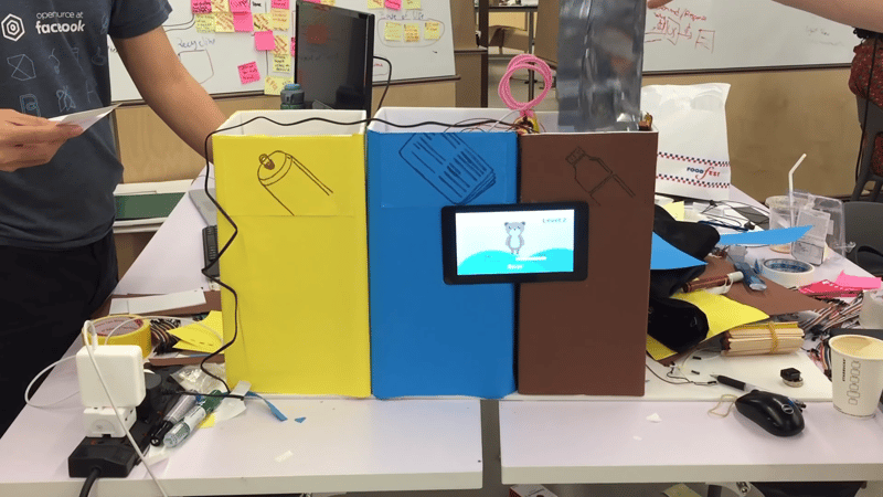 The design of our user interface has to achieve two objectives - attracting kids and educating them. Thus, we designed the software as a second-person pet game with cute animal characters. The clothing and appearance of the characters evolve when it gains experience points. And experience can be gained by throwing the right trash into the bins, while keeping as little trash as possible. The interface is displayed on a touch screen powered by Raspberry. We embedded the entire hardware module into four trash bins made of plastic.